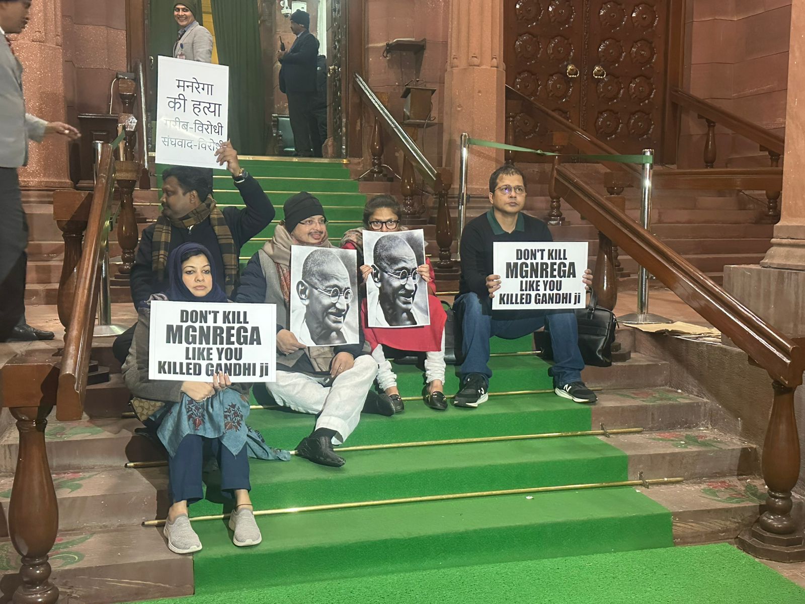 The dharna is taking place outside Samvidhan Sadan in the Parliament complex against the Bill. This bill was passed in the Lok Sabha on December 18, 2025, and subsequently cleared by the Rajya Sabha early on December 19, amid significant opposition.